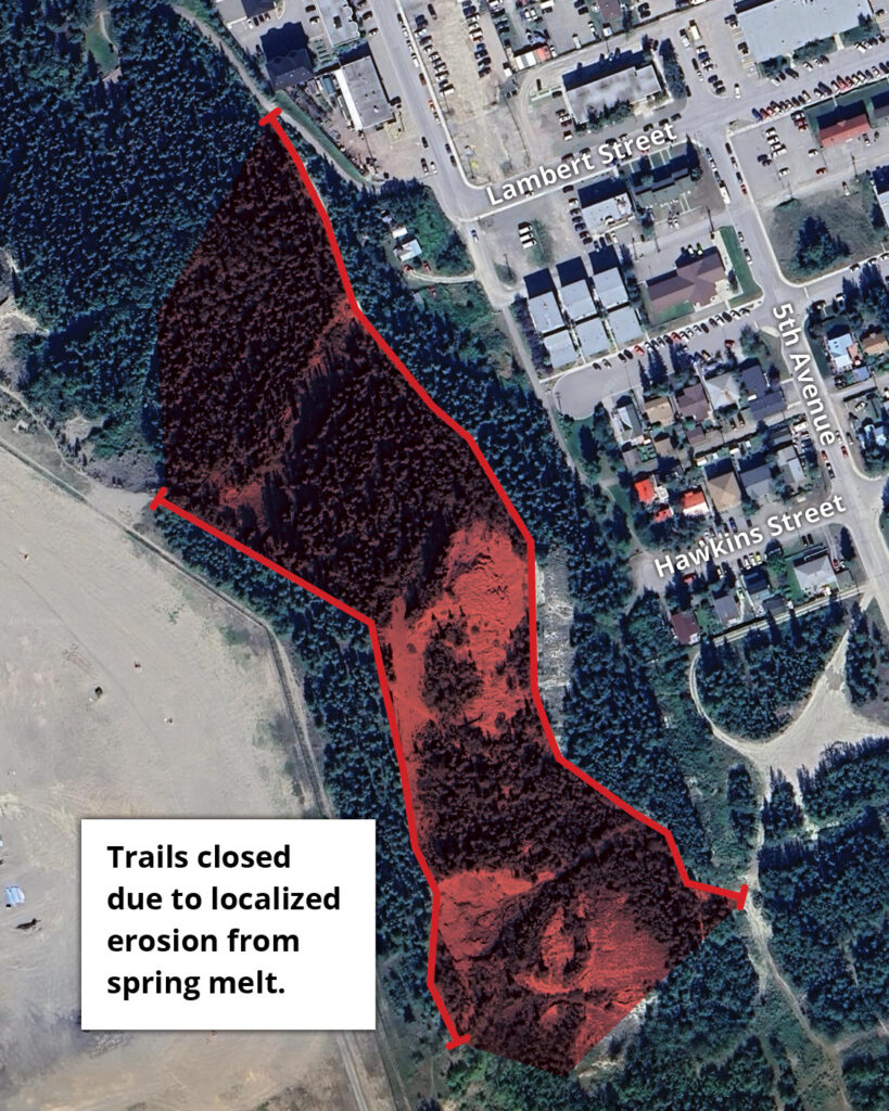 Spring snow melt is causing localized erosion in the area. The City made the decision to close trails to keep trail users safe. The Black Street stairs remain open.