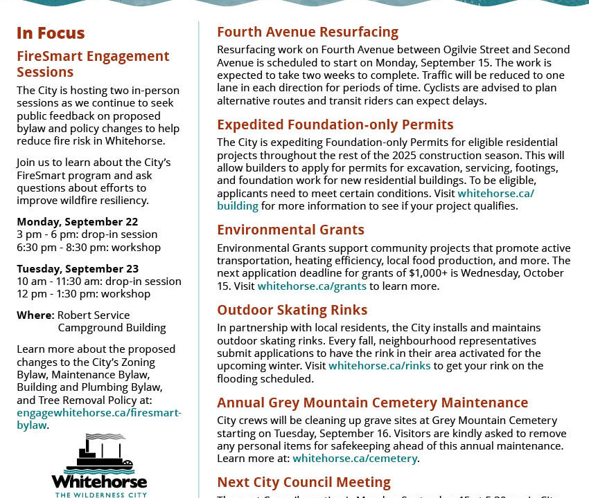 The City of Whitehorse will host two days of FireSmart info sessions and workshops at the Robert Service Campground this month. The public engagement sessions will […]
