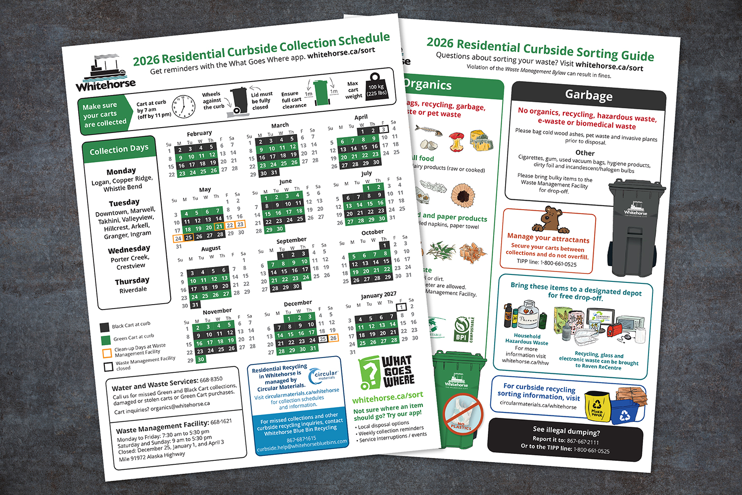 Want to learn what goes where? Check out our Waste and Organics Sorting Guides in English, French, German, Northern Tutchone, Southern Tutchone, Tagalog, and Punjabi. Click and print copies for your home and office.