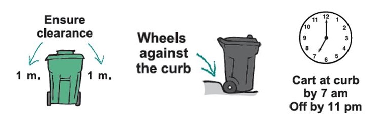 Waste and organics collection alternates weekly between general waste (Black Cart) and organic waste (Green Cart). Recycling is picked up every second week.
