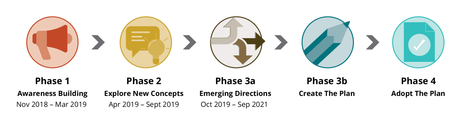 Phase 2, called “Explore New Concepts”, is about taking the big ideas collected from the public in Phase 1, and testing and considering them in more detail. Ideas are generally limited to those that don’t already have recent planning work completed. In Phase 3, we will combine these with other planning work that’s already been previously completed to create a draft plan.